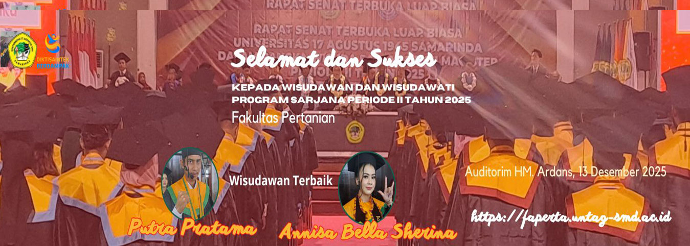 Fakultas Pertanian Universitas 17 Agustus 1945 Samarinda. Kuliah dilaksanakan Pertemuan Tatap Muka (PTM). Perkuliahan sesuai jadwal dilaksanakan mulai tanggal 05 September 2022 s.d. 22 Desember 2022. Materi bisa diunduh di https://spada.untag-smd.ac.id/login/signup.php? bagi yang belum, sedangkan yang sudah mendaftar silahkan login untuk melihat materi kuliah di elearning. Terima kasih atas perhatiannya.